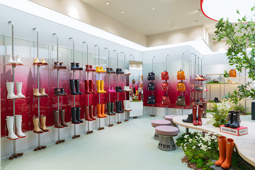 作为品牌展现生活方式理念的重要载体,该店汇集经典惠灵顿雨靴、猎鸭靴、雪地靴、功能背包及都市功能服饰全系列产品,致力于满足消费者从都市通勤到户外探索的多场景穿搭需求。每一处产品陈列区域皆采用结合自然置景的场景化布局,邀请顾客体验HUNTER所带来的可持续时尚与轻户外文化融合的全新风貌。