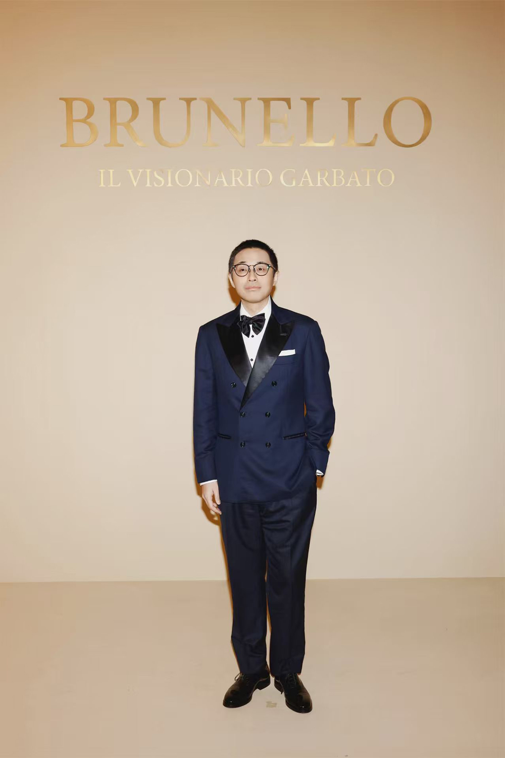 电影导演、编剧文牧野身着Brunello Cucinelli海军蓝戗驳领丝绸礼服西装与长裤,搭配漆面小牛皮牛津鞋及配饰亮相金色长毯。
