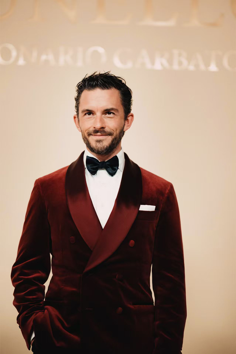 演员乔纳森·贝利(Jonathan Bailey)身着Brunello Cucienlli暗勃艮第红青果领天鹅绒礼服西装与长裤亮相金色长毯。