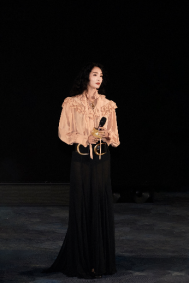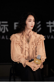 中国女演员王紫璇身着丝质提花荷叶边廓形衬衫上衣和黑色丝绸薄纱超长半身裙,出席于海南三亚举办的2025海南岛国际电影节《我是全世界最幸福的宝贝》映后礼。