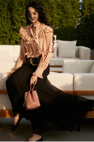 她为本次造型搭配了金色Château Treasures项链, Eternity戒指,黑色Misty平底鞋,并配有超大金色扣环的Anita复古腰带和杏仁糖色Spin小号手提包。