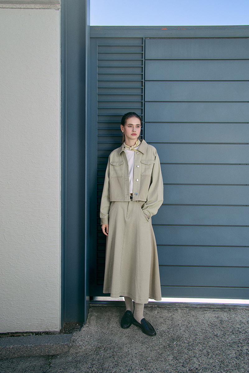 - · 女款短版非牛仔工装夹克,利落短版剪裁重塑工装新韵,背幅品牌皮革标牌铭刻经典印记,同色系面料巧妙混搭,层次美学跃然眼前。搭配同系列女款工装A字裙,柔美与硬朗交织,都市造型中尽显女性摩登风范。
