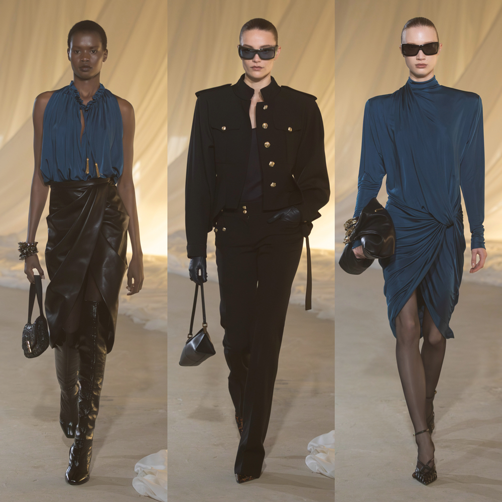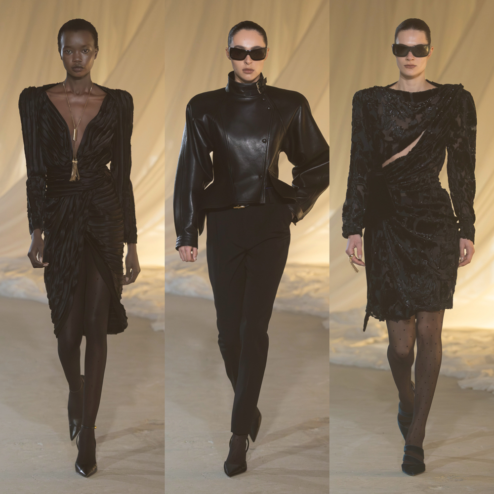 愈发轻盈的结构与趋于流动的垂坠交织并重,正如对“性感的力量”与“力量的性感”的双重强调。Tron着迷于1940年代黑色电影里那些肩线硬朗,有着深邃优雅与狩猎式性感的女主角,也深受1980年代新黑色电影中与她们风格一脉相承的女性角色所吸引。本次秀场布景同样极具电影感,由常驻柏林、近期荣获威尼斯建筑双年展金狮奖的建筑师Andrea Faraguna操刀打造。布景从暗夜氛围渐次过渡至光影充盈的场域,引领BALMAIN迈向崭新纪元。