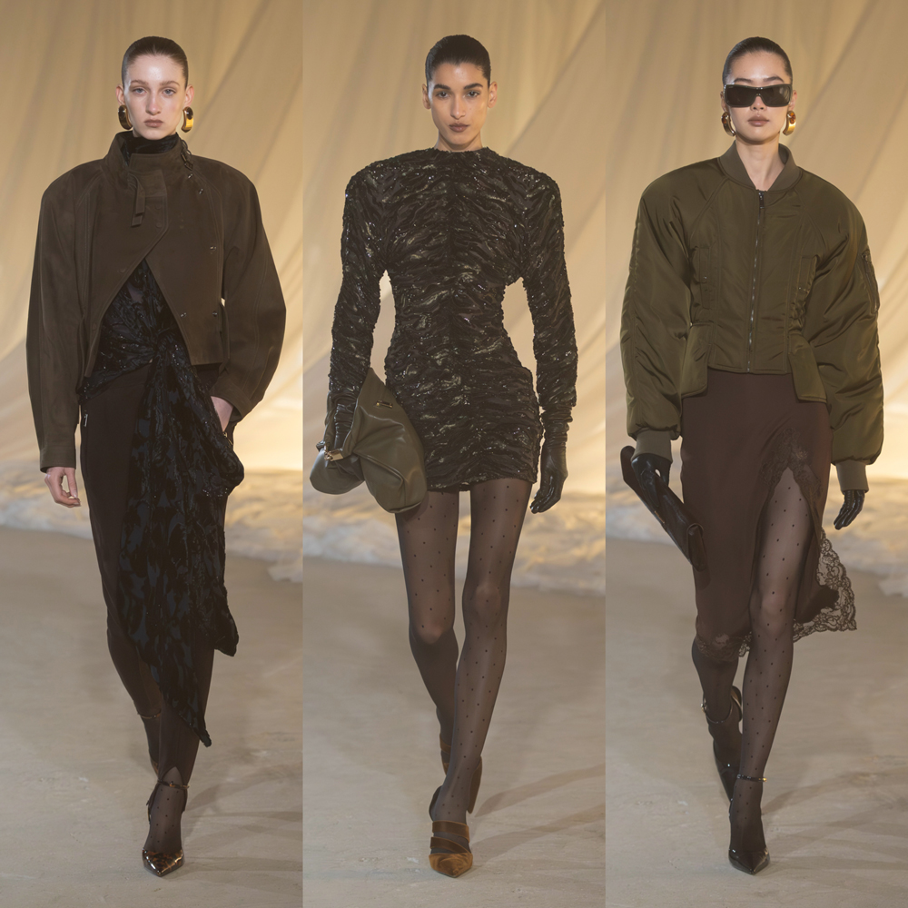 作为Tron执掌后的首个系列,本季彰显了他的创作愿景与雄心:拥抱身体的动态美学;打造一种更贴近现实与日常的魅力,更显轻盈、自由、便于行动;向品牌高级定制传统致敬,强调手工匠艺,发展出新一代丰盈而不过度张扬的奢华面料。丝缎、天鹅绒、羊剪绒、提花织物、皮革与蕾丝,交织于深邃的午夜色调中,并以紫色与绿色唤起自然的丰沛意象。Tron的新款手袋,则延续触觉体验与实用主义,又融入一抹感官张力:Sphynx手袋,以沙漏轮廓勾勒柔软结构;手提式Dinner at 8晚宴包,灵感则源自Tron的冲浪装备,将功能性设计转化为具有触感的独特表达。