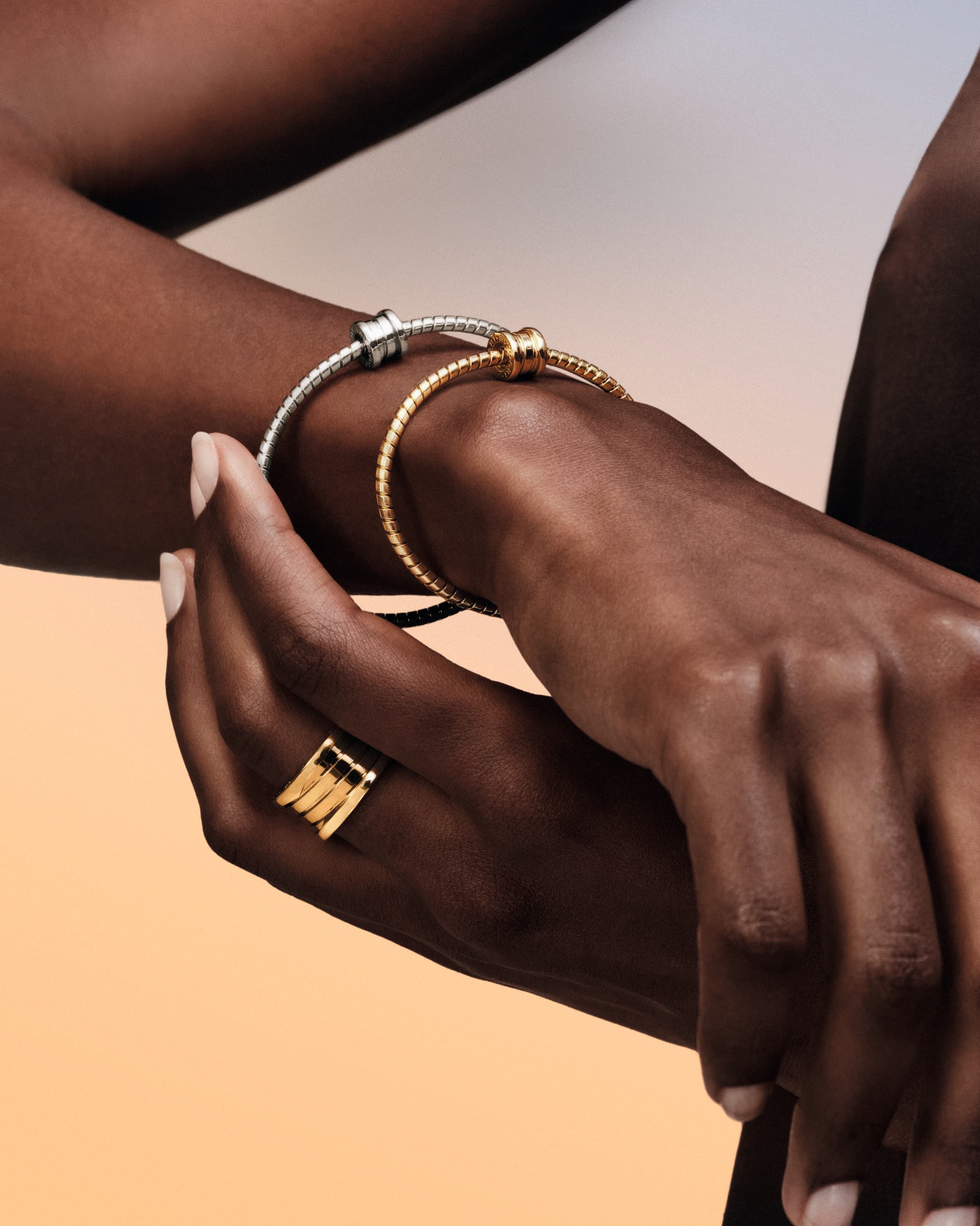 此款手镯提供白色18K金、18K黄金与18K玫瑰金三种材质选择,既可单枚佩戴,亦可随心叠搭,生动展现B.zero1系列所倡导的自由演绎、多元搭配与个性表达的当代珠宝创作理念。