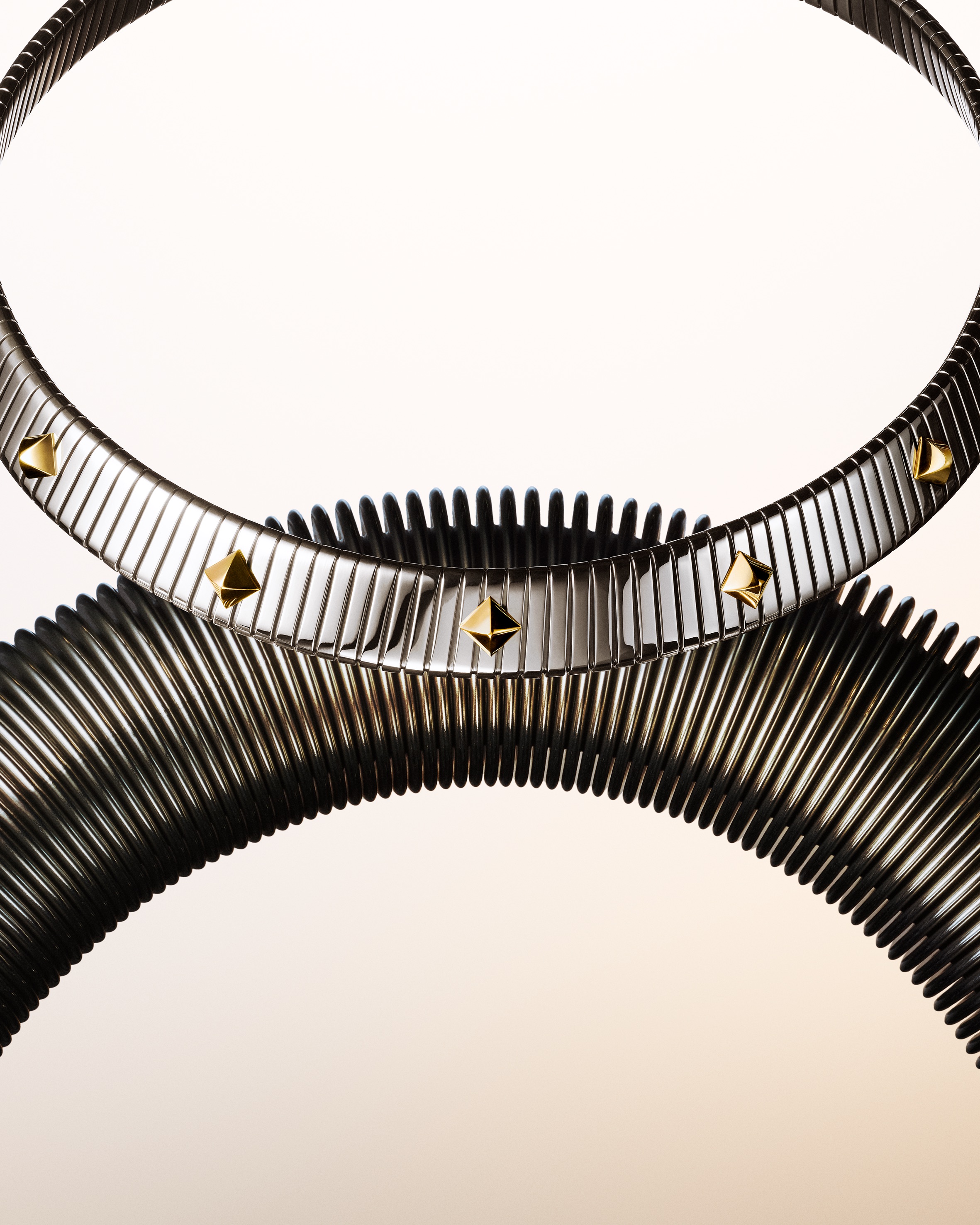 Tubogas系列以锐意创新为核心理念,瞩目推出项链与手镯新作,开启一场前卫美学与珠宝设计的灵感对话。呼应20世纪70年代大胆不羁的设计风格,新作以精钢材质打造出灵动盘绕的经典Tubogas螺旋造型,呈现出浑然一体的视觉效果。18K黄金饰钉点缀其上,为整体设计增添了丰富的层次感与精致的对比美感。18K黄金与精钢精妙交融,赋予造型更为流畅灵动的美感,亦彰显大胆创意与精湛工艺深度融合的设计理念。