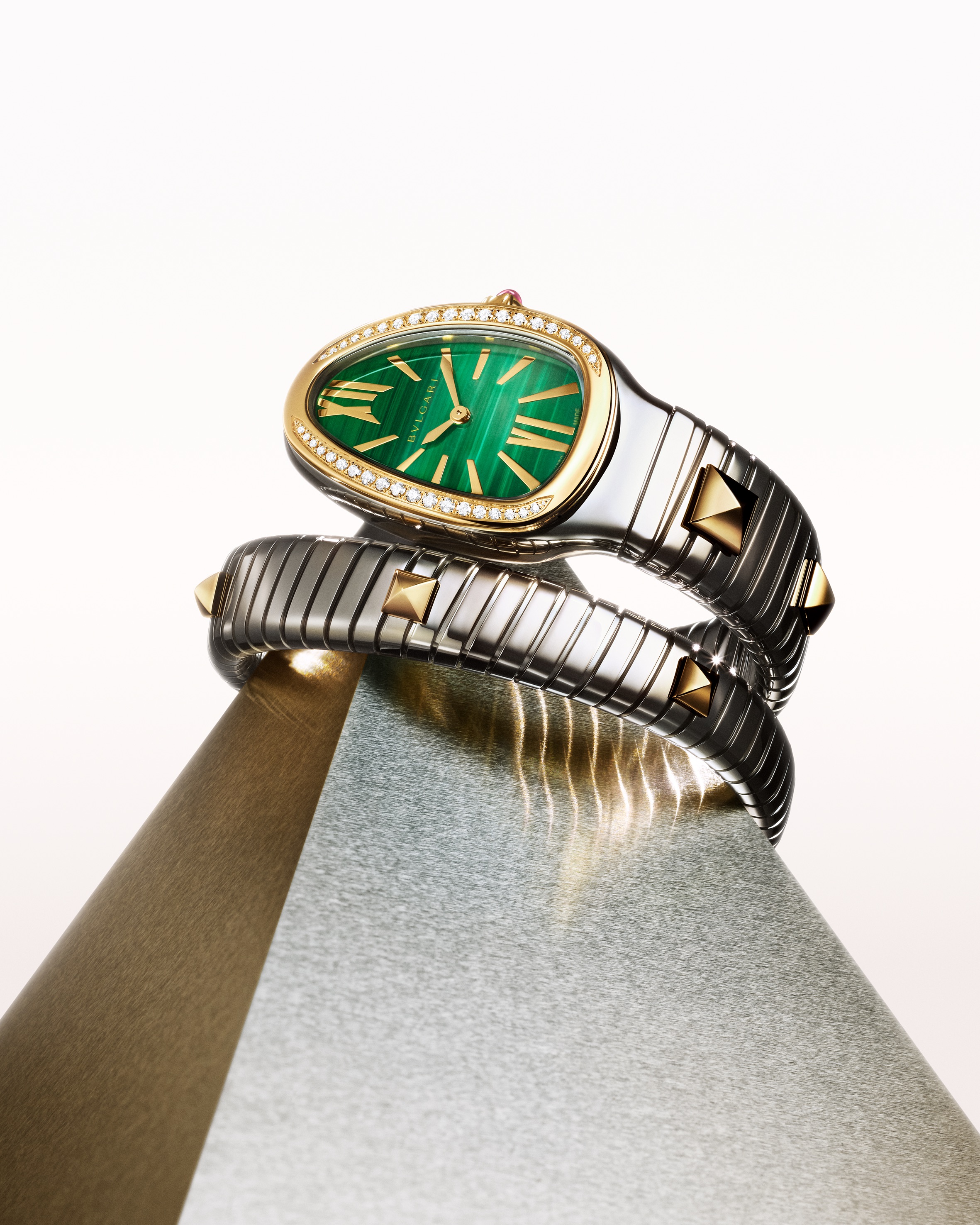 Serpenti Tubogas Studs胶囊腕表将“金与精钢”的创作构想延伸至制表领域,呈现出颇具雕塑感的时计臻作。新款腕表中,Serpenti系列经典的灵蛇造型缱绻环抱柔韧的Tubogas表链,灵感源自宝格丽珠宝设计语言的饰钉元素跃现其上,更添个性风范。该系列此次特别发行4枚新款腕表,深入探索18K金与精钢交织而成的美学张力;宝石表盘的搭配与精美细节、钻石及珍珠母贝的点缀,进一步凸显了腕表优雅的建筑结构美感。