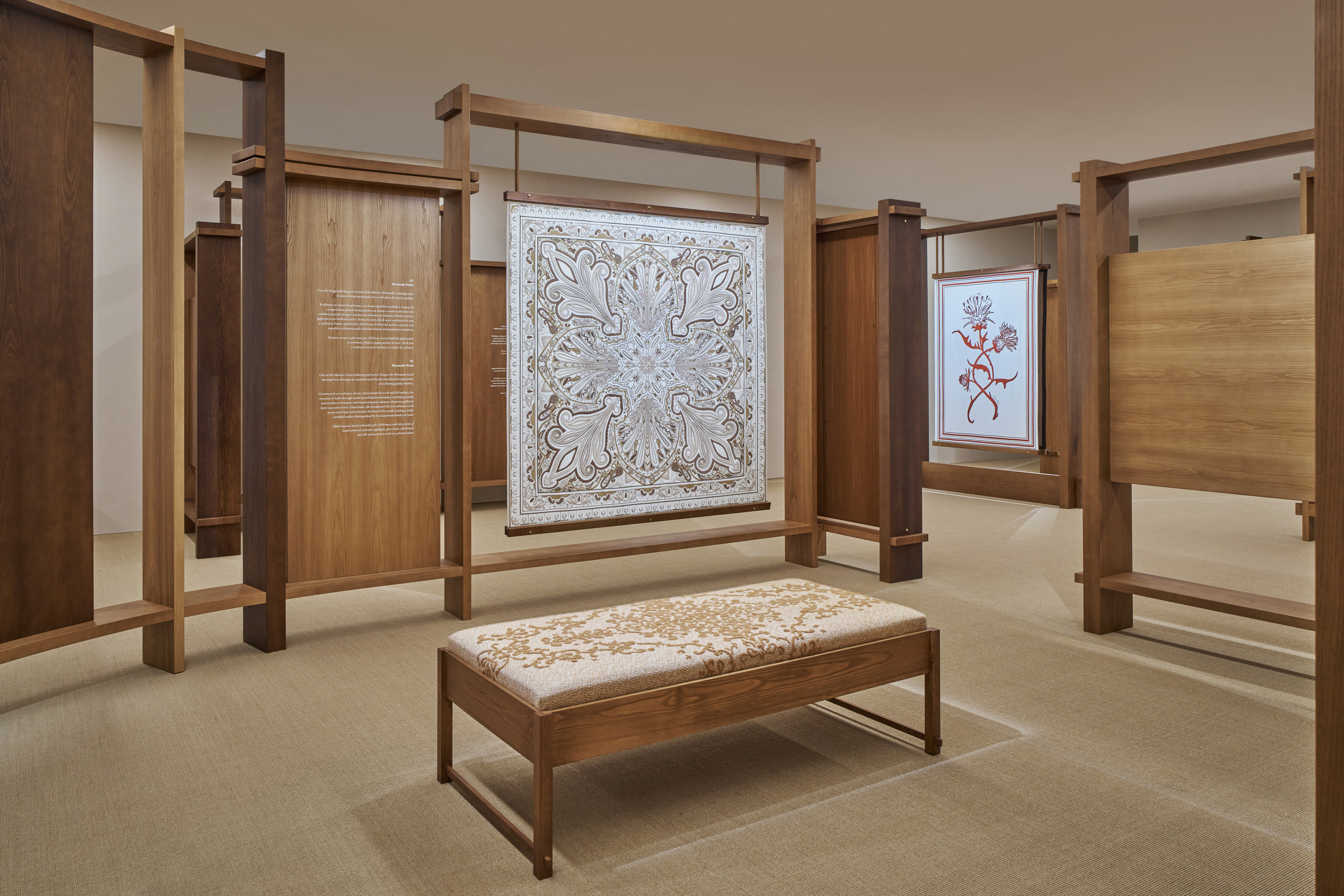 第一章采用廊道布景结构。参观者将会观赏 25 款盖毯设计,每一款均作为独立研究项目呈现。这些别致展品在工艺、结构、图案与整饰处理方面各具特色,共同构成一份索引,展现同一单品的多种设计思路。